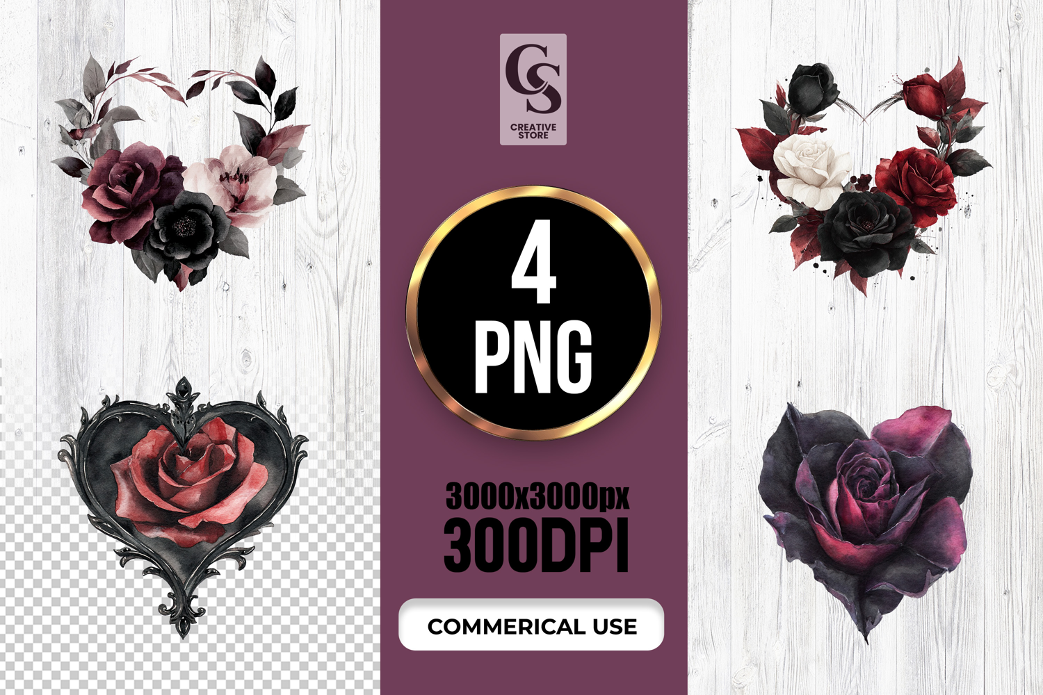 4 Dark Gothic Rose Heart Clipart Sublimation PNG Files Perfect for Greeting Cards, Invitations, Junk Journal, Party Decor, Scrapbooking and many other craft projects.