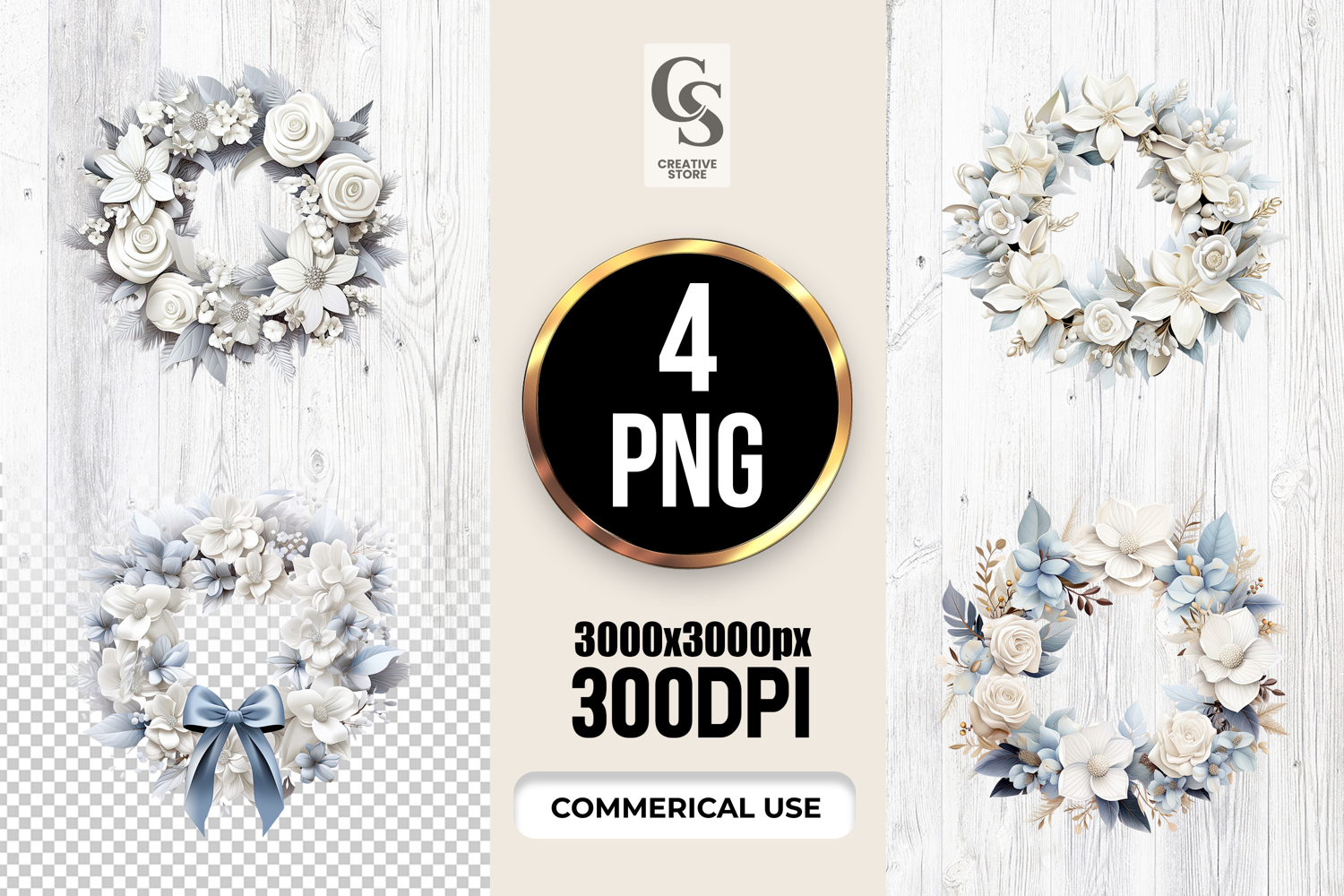 4 White & Blue Floral Wreath Watercolor Clipart PNG Files Perfect for Greeting Cards, Invitations, Junk Journal, Party Decor, Scrapbooking and many other craft projects.