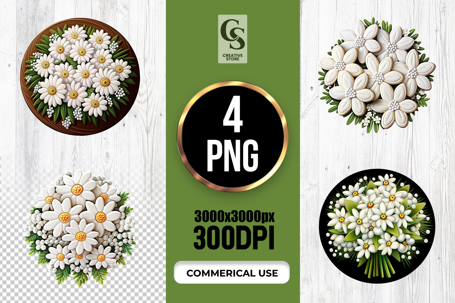 4 White Daisy Floral Wreath Illustration Clipart PNG Files Perfect for Greeting Cards, Invitations, Junk Journal, Party Decor, Scrapbooking and many other craft projects.
