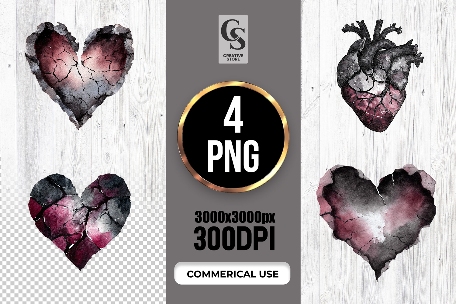 4 Dark Cracked Heart Watercolor Clipart Sublimation PNG  Files Perfect for Greeting Cards, Invitations, Junk Journal, Party Decor, Scrapbooking and many other craft projects.