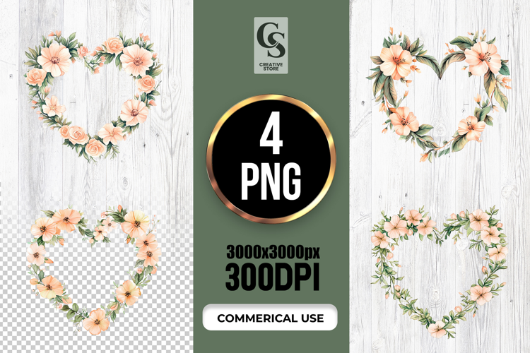 4 Peach Floral Heart Wreath Clipart Sublimation PNG  Files Perfect for Greeting Cards, Invitations, Junk Journal, Party Decor, Scrapbooking and many other craft projects.