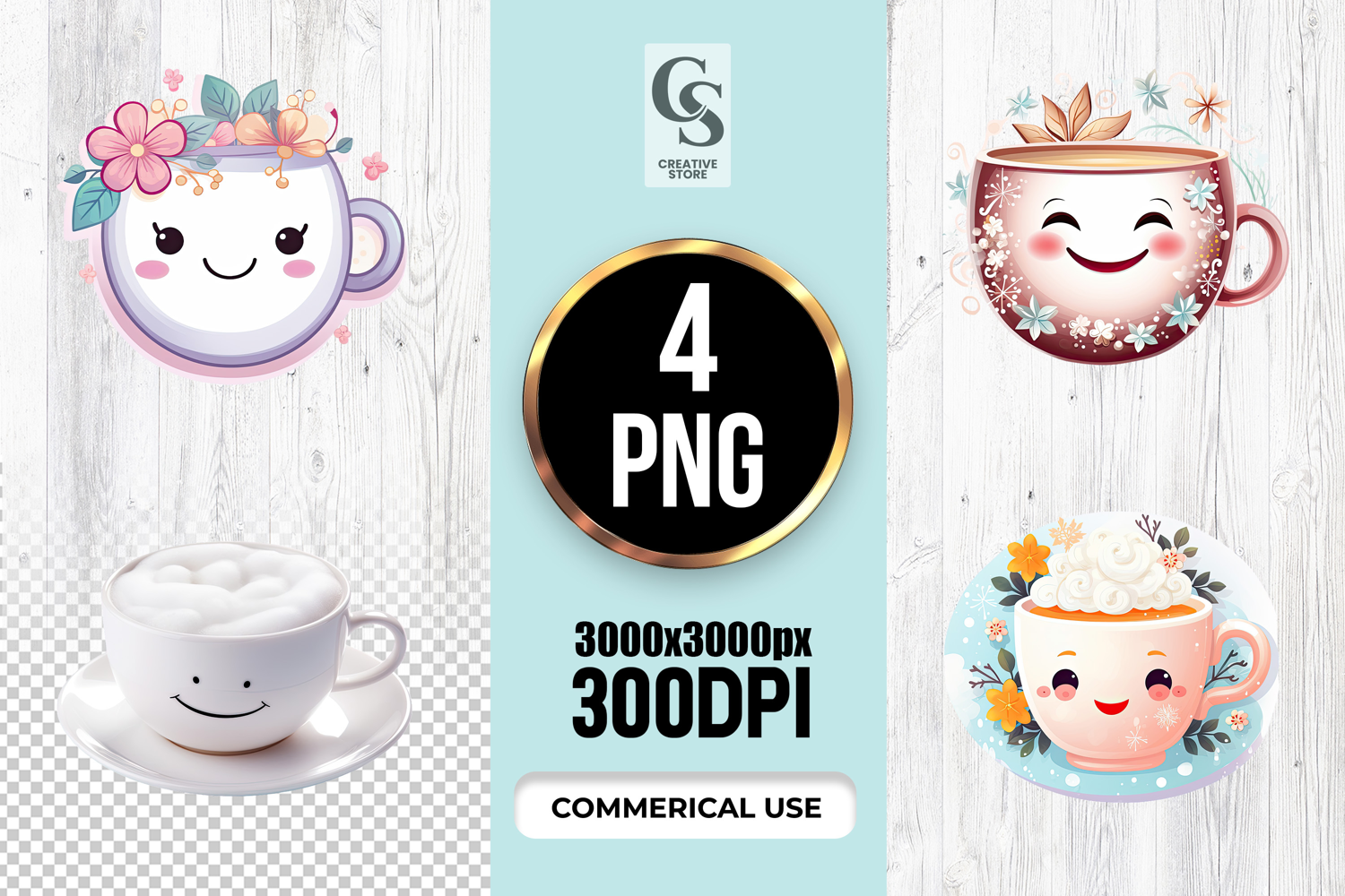 4 Cute Smiling Coffee Cup Illustration Clipart Sublimation PNG   Files Perfect for Greeting Cards, Invitations, Junk Journal, Party Decor, Scrapbooking and many other craft projects.