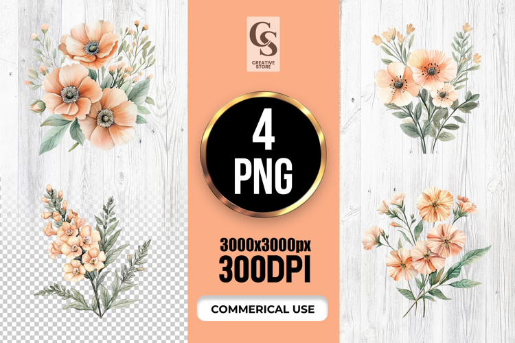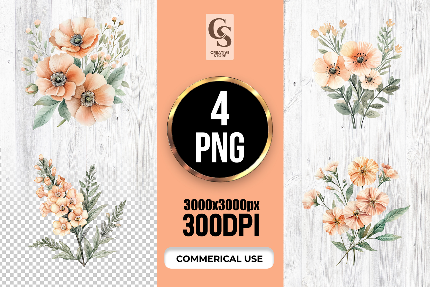 4 Peach Watercolor Floral Clipart Sublimation PNG Files Perfect for Greeting Cards, Invitations, Junk Journal, Party Decor, Scrapbooking and many other craft projects.