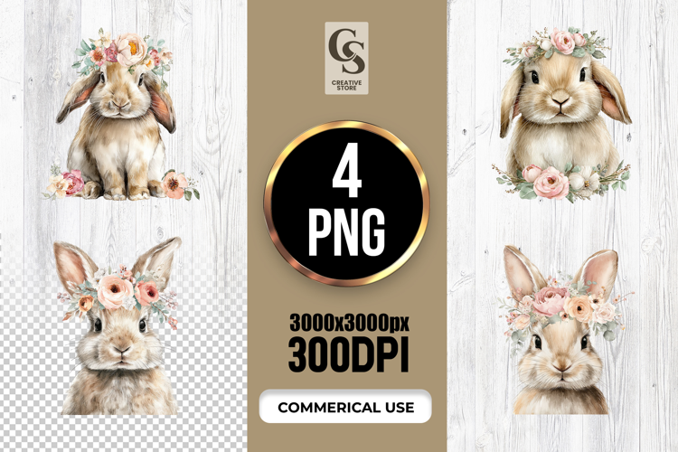4 Floral Crown Bunny Watercolor Clipart Sublimation PNG Clipart Files Perfect for Greeting Cards, Invitations, Junk Journal, Party Decor, Scrapbooking and many other craft projects.