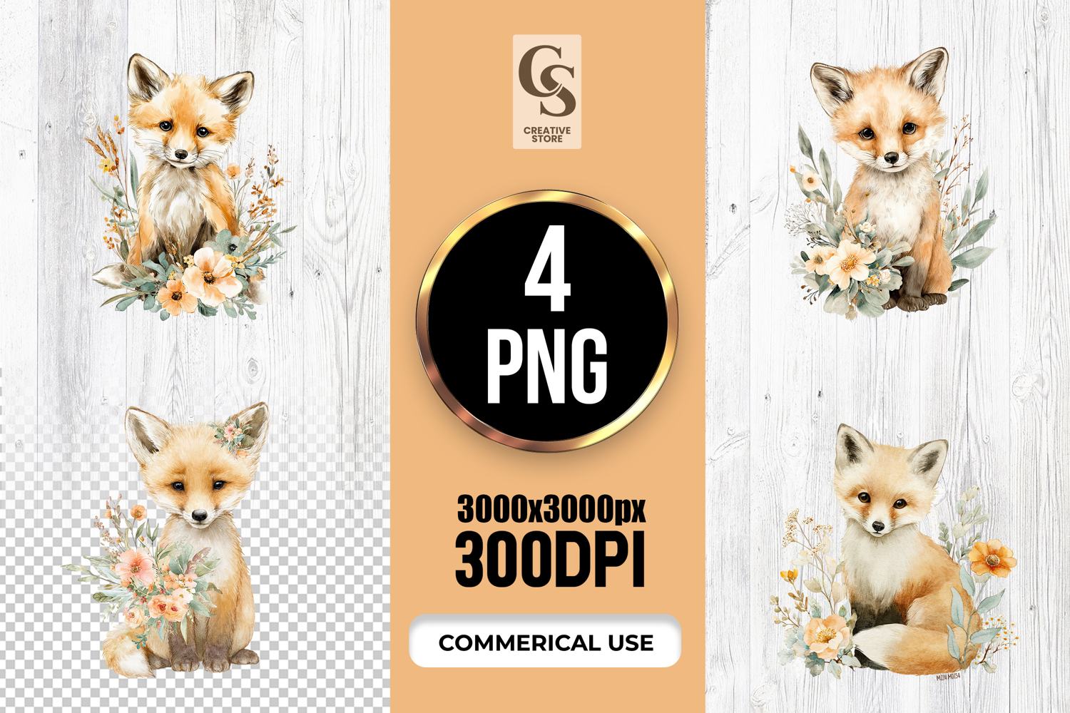 4 Watercolor Floral Fox Clipart Sublimation PNG Clipart Files Perfect for Greeting Cards, Invitations, Junk Journal, Party Decor, Scrapbooking and many other craft projects.