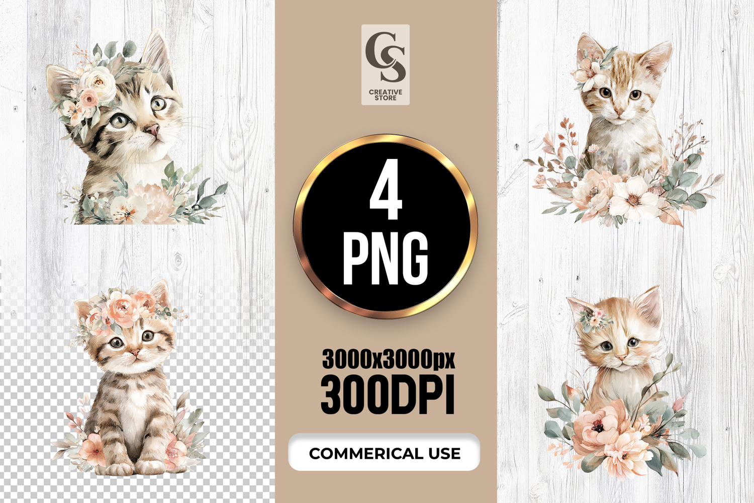 4 Watercolor Floral Kittens Clipart Sublimation PNG Clipart Files Perfect for Greeting Cards, Invitations, Junk Journal, Party Decor, Scrapbooking and many other craft projects.