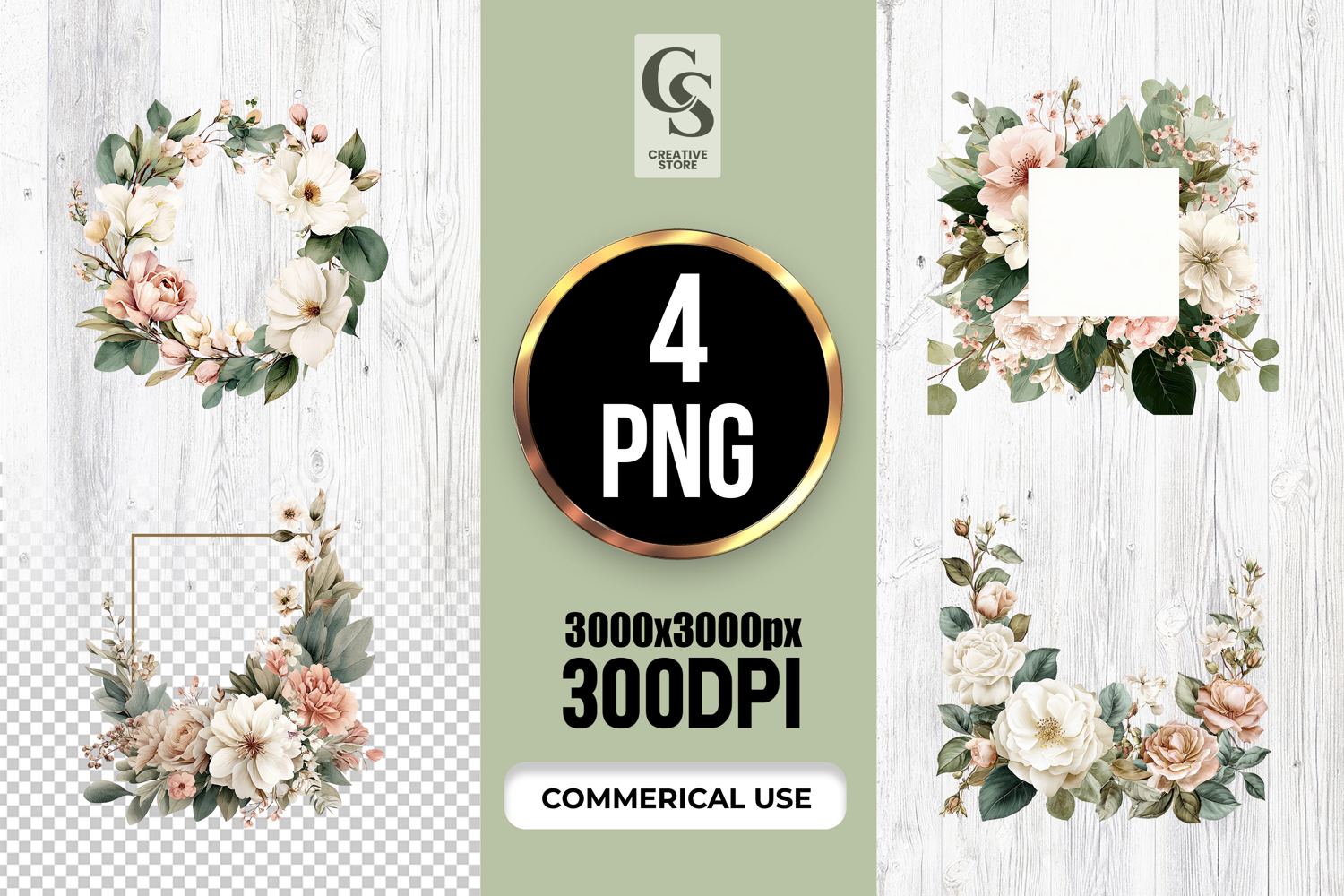 4 Sage Green Watercolor Floral Frames & Wreaths PNG Clipart Files Perfect for Greeting Cards, Invitations, Junk Journal, Party Decor, Scrapbooking and many other craft projects.