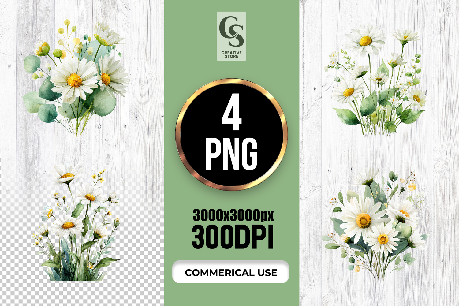 4 Delicate White Daisy & Eucalyptus Watercolor PNG  Files Perfect for Greeting Cards, Invitations, Junk Journal, Party Decor, Scrapbooking and many other craft projects.