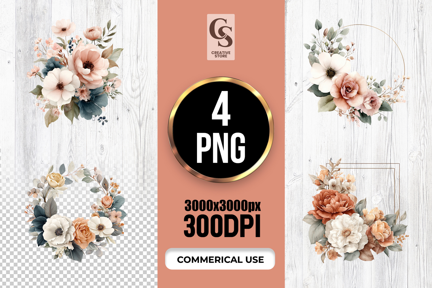 4 Boho Floral Arrangement Watercolor Clipart Sublimation PNG  Files Perfect for Greeting Cards, Invitations, Junk Journal, Party Decor, Scrapbooking and many other craft projects.