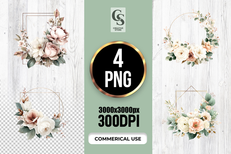 4 Elegant Floral Wreath Watercolor Clipart Sublimation PNG  Files Perfect for Greeting Cards, Invitations, Junk Journal, Party Decor, Scrapbooking and many other craft projects.