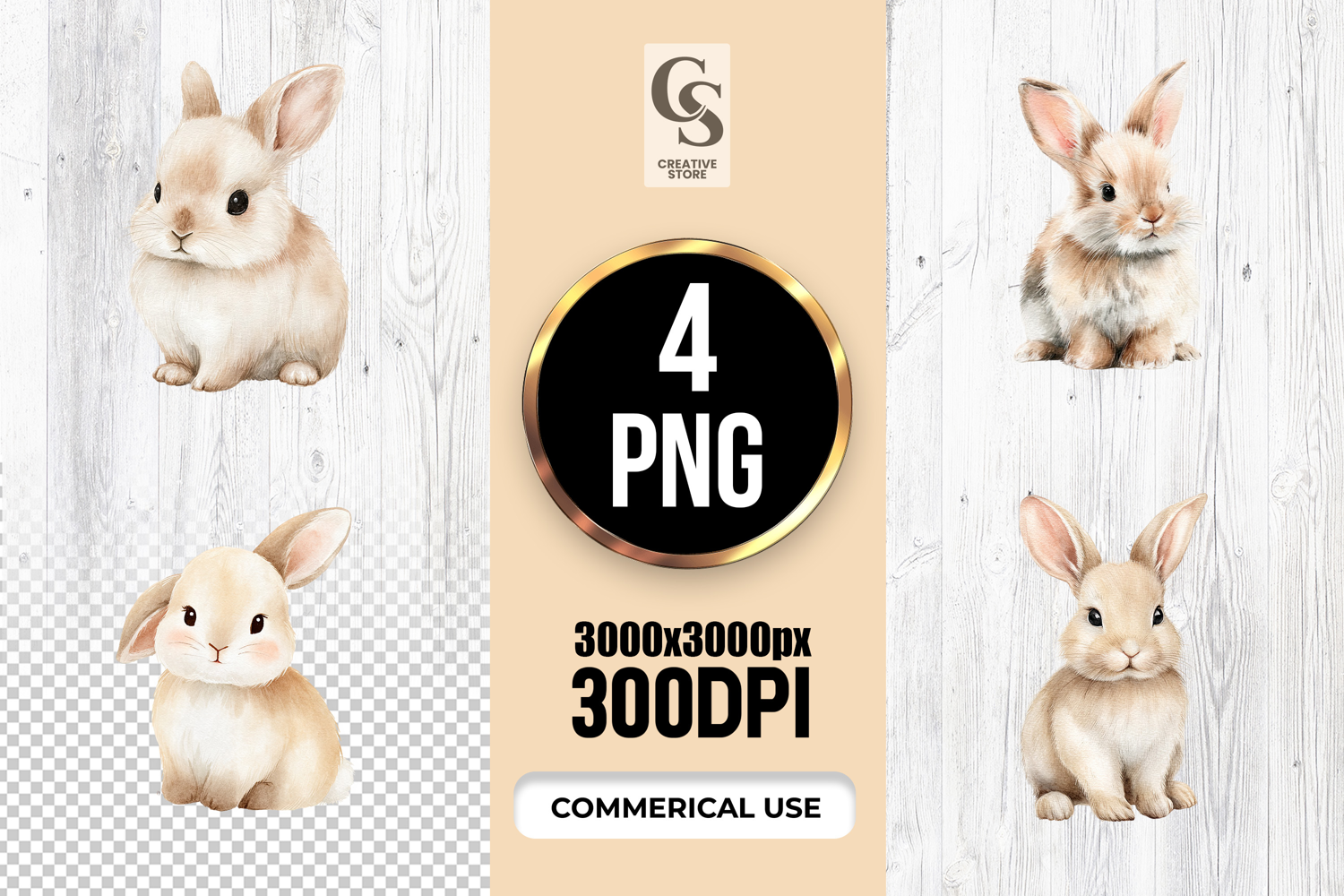 4 Soft Beige Baby Bunny Watercolor Clipart Sublimation PNG Files Perfect for Greeting Cards, Invitations, Junk Journal, Party Decor, Scrapbooking and many other craft projects.