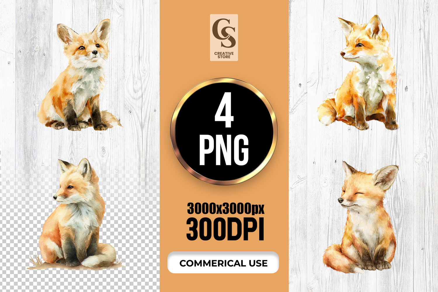 4 Cute Watercolor Baby Fox Clipart Sublimation PNG Files Perfect for Greeting Cards, Invitations, Junk Journal, Party Decor, Scrapbooking and many other craft projects.
