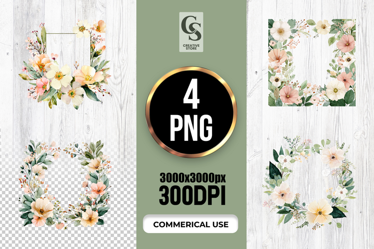 4 Watercolor Floral Square Wreath Frame Clipart PNG Files Perfect for Greeting Cards, Invitations, Junk Journal, Party Decor, Scrapbooking and many other craft projects.