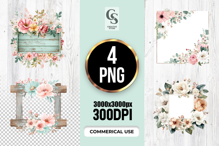 4 Watercolor Floral Wooden Frame Clipart Sublimation PNG Files Perfect for Greeting Cards, Invitations, Junk Journal, Party Decor, Scrapbooking and many other craft projects.