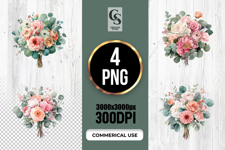 4 Blush Floral Bouquet Watercolor Clipart Sublimation PNG Files Perfect for Greeting Cards, Invitations, Junk Journal, Party Decor, Scrapbooking and many other craft projects.