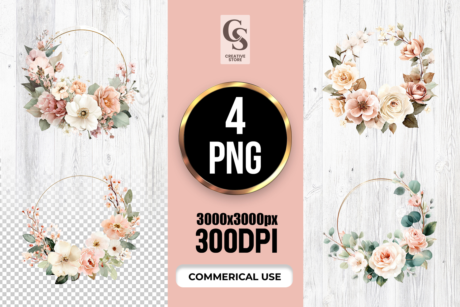 4 Blush Beige Floral Wreath Watercolor Clipart Sublimation PNG Files Perfect for Greeting Cards, Invitations, Junk Journal, Party Decor, Scrapbooking and many other craft projects.