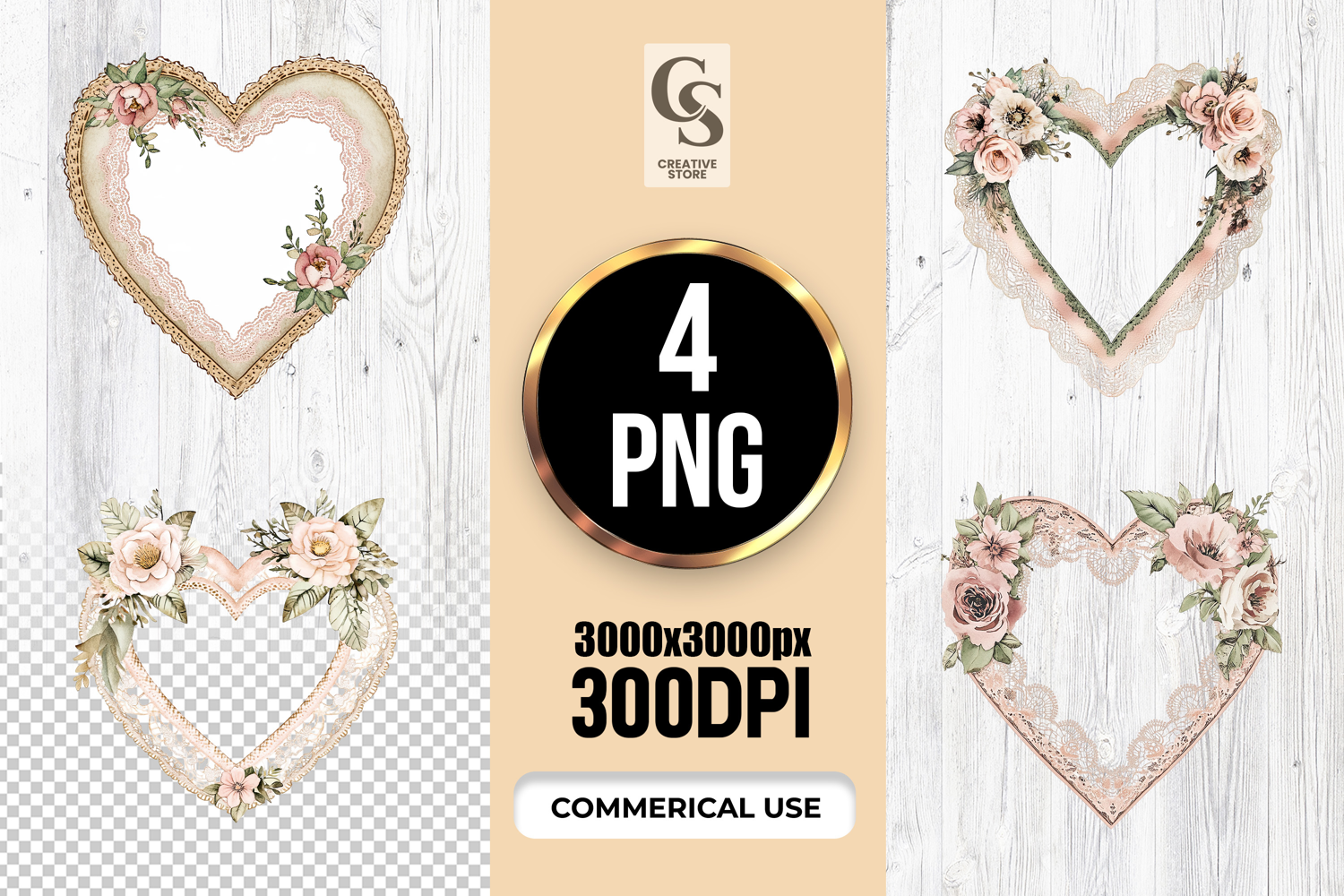 4 Vintage Lace Floral Heart Frame PNG Set Files Perfect for Greeting Cards, Invitations, Junk Journal, Party Decor, Scrapbooking and many other craft projects.