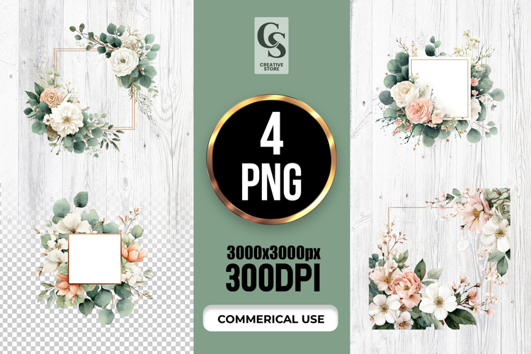 4 Watercolor Greenery Floral Square Frame PNG Files Perfect for Greeting Cards, Invitations, Junk Journal, Party Decor, Scrapbooking and many other craft projects.