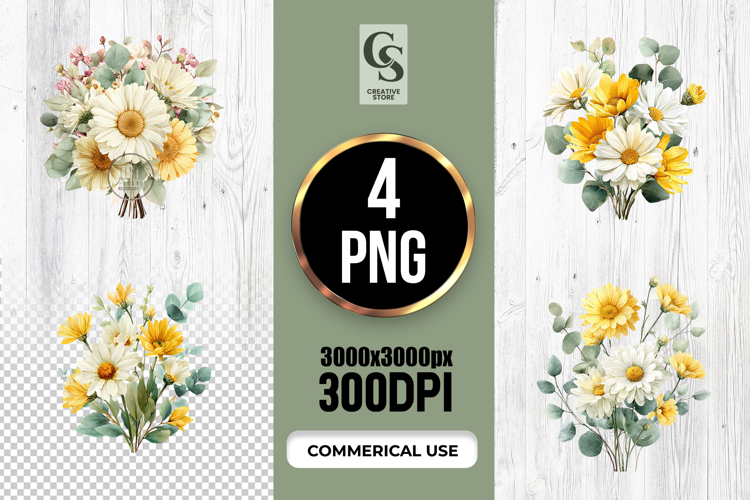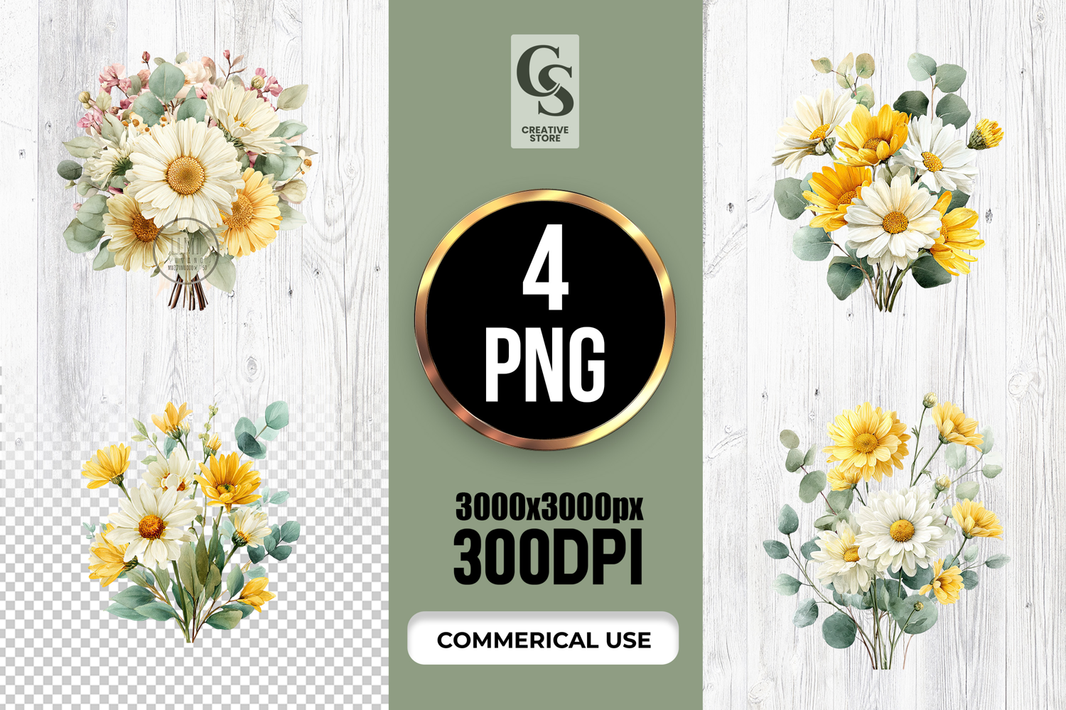 4 Yellow Daisy Floral Bouquet Clipart Sublimation PNG Files Perfect for Greeting Cards, Invitations, Junk Journal, Party Decor, Scrapbooking and many other craft projects.