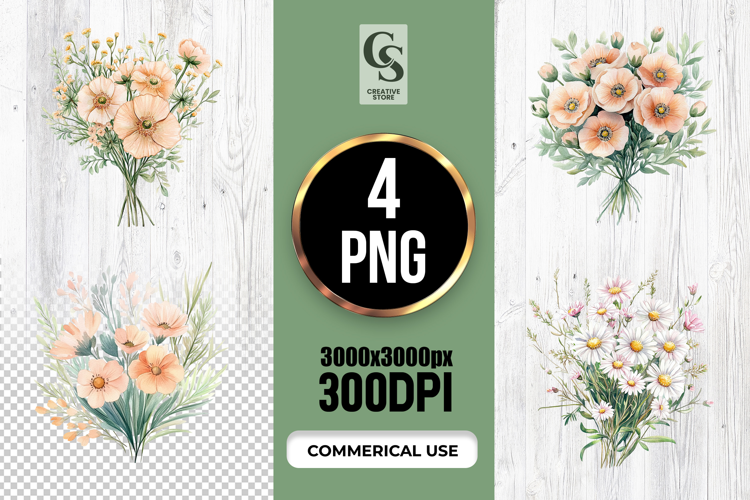 4 Peach Wildflower Bouquet Clipart Sublimation PNG Files Perfect for Greeting Cards, Invitations, Junk Journal, Party Decor, Scrapbooking and many other craft projects.