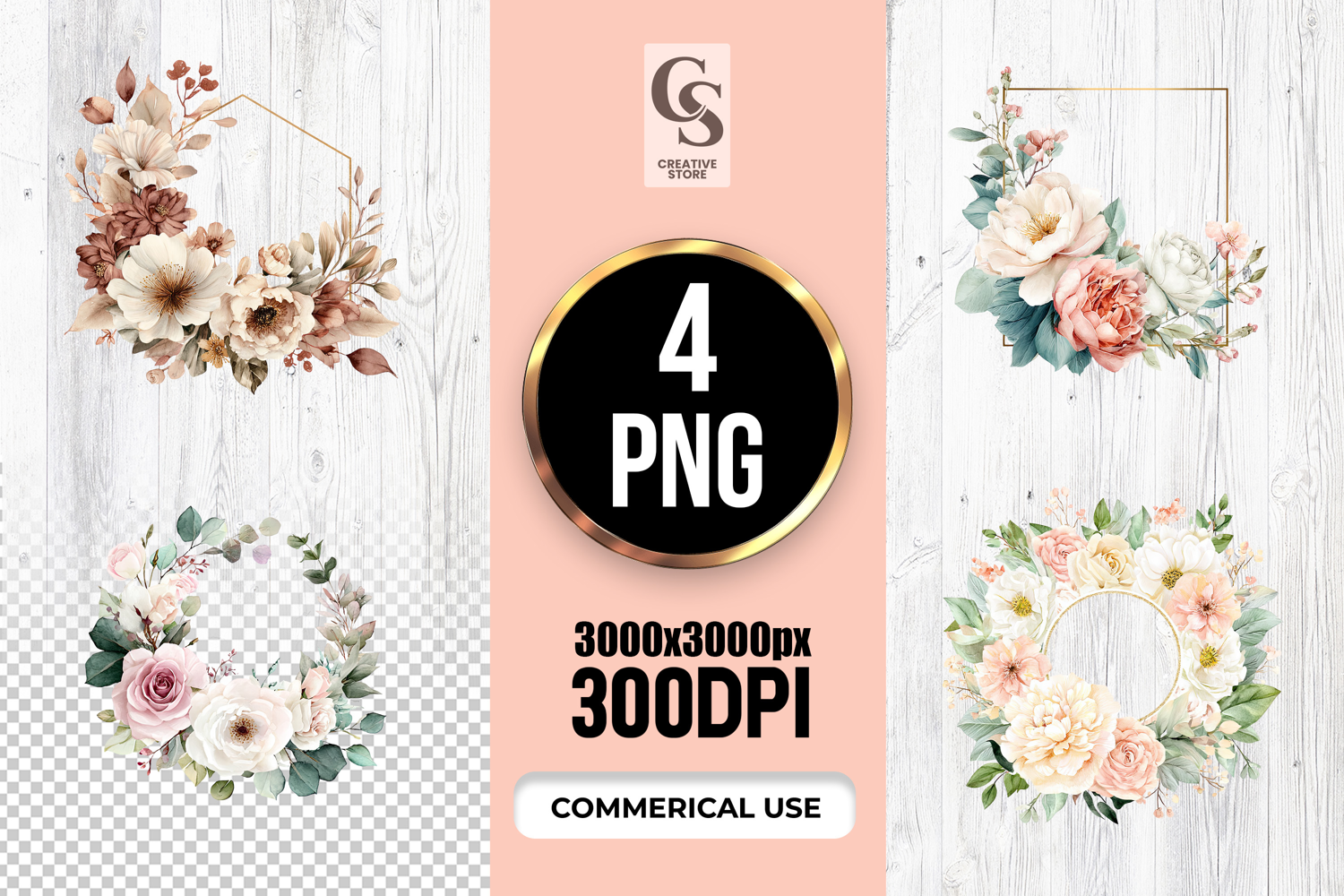 4 Watercolor Floral Frame Clipart Sublimation PNG Files Perfect for Greeting Cards, Invitations, Junk Journal, Party Decor, Scrapbooking and many other craft projects.