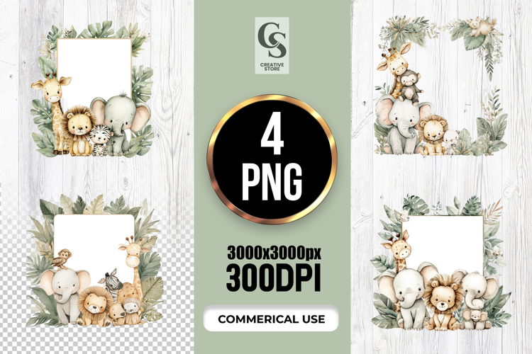 4 Cute Jungle Baby Animals Frame Clipart Sublimation PNG Clipart Files Perfect for Greeting Cards, Invitations, Junk Journal, Party Decor, Scrapbooking and many other craft projects.