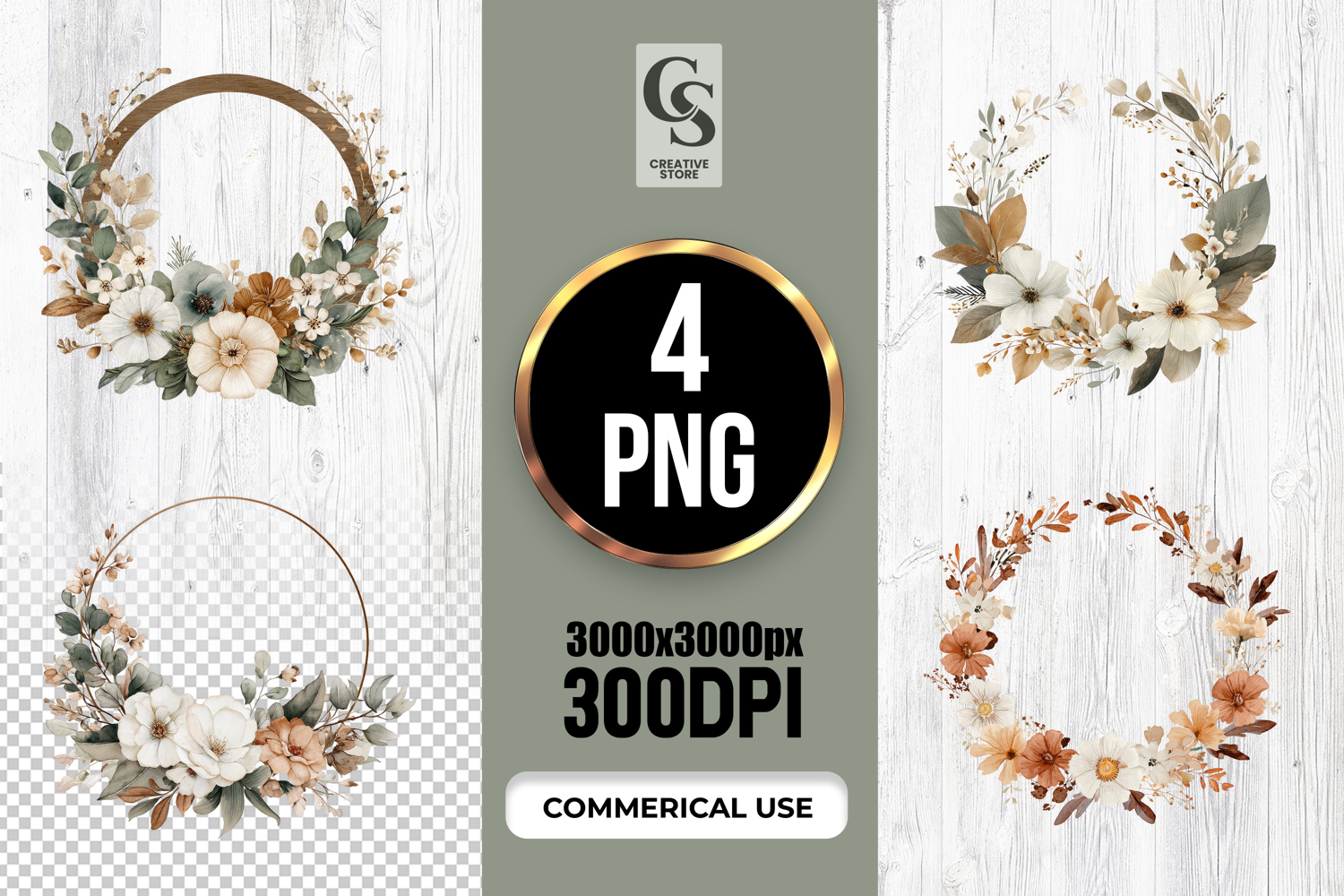 4 Neutral Watercolor Floral Wreath Clipart Sublimation PNG Files Perfect for Greeting Cards, Invitations, Junk Journal, Party Decor, Scrapbooking and many other craft projects.