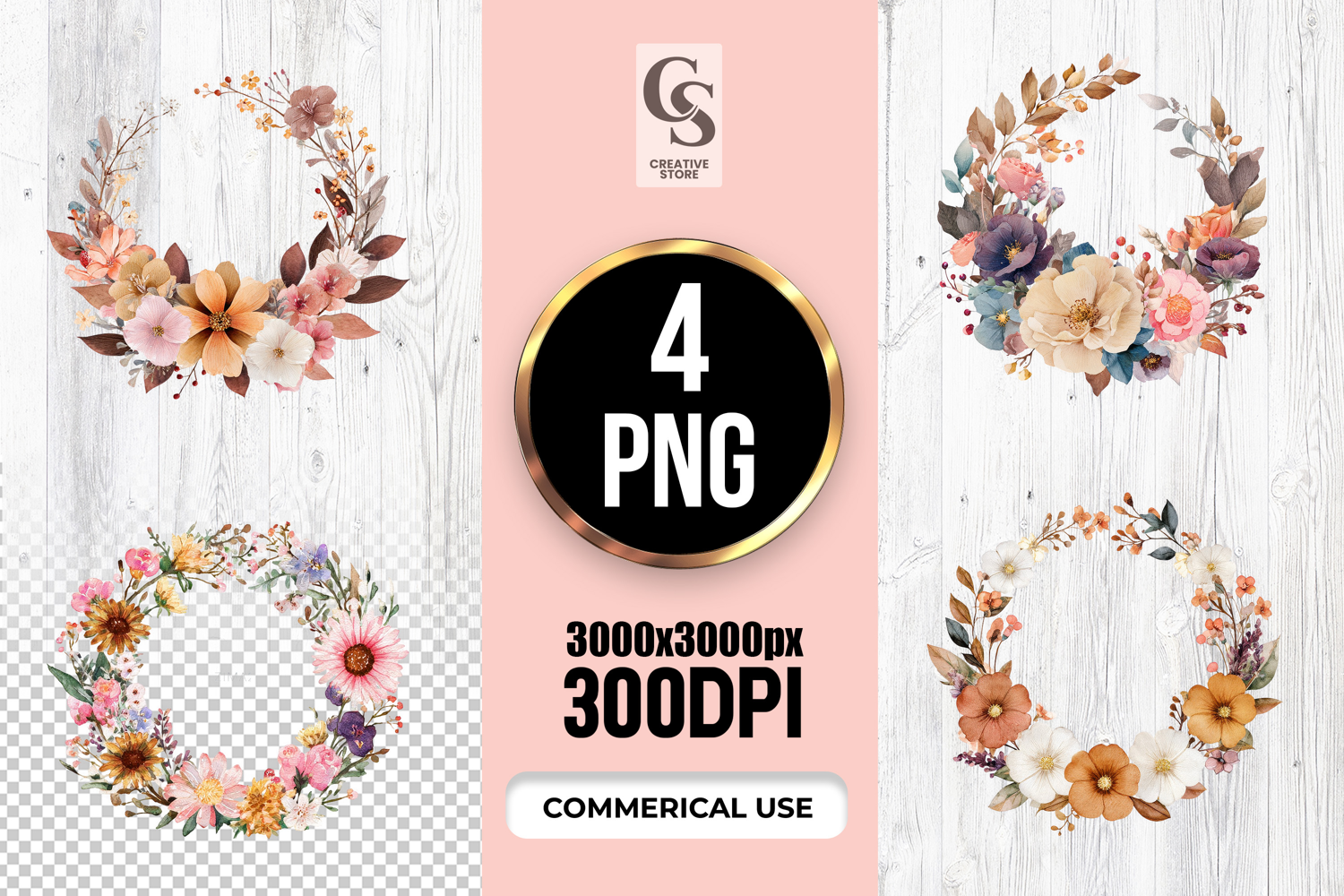 4 Colorful Watercolor Floral Wreath Clipart Sublimation PNG Files Perfect for Greeting Cards, Invitations, Junk Journal, Party Decor, Scrapbooking and many other craft projects.