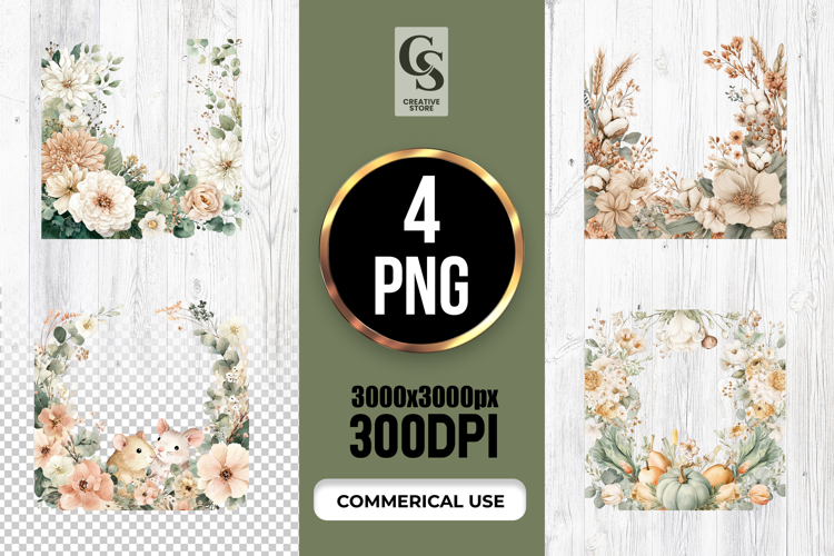 4 Neutral Floral Frame Clipart Sublimation PNG Files Perfect for Greeting Cards, Invitations, Junk Journal, Party Decor, Scrapbooking and many other craft projects.
