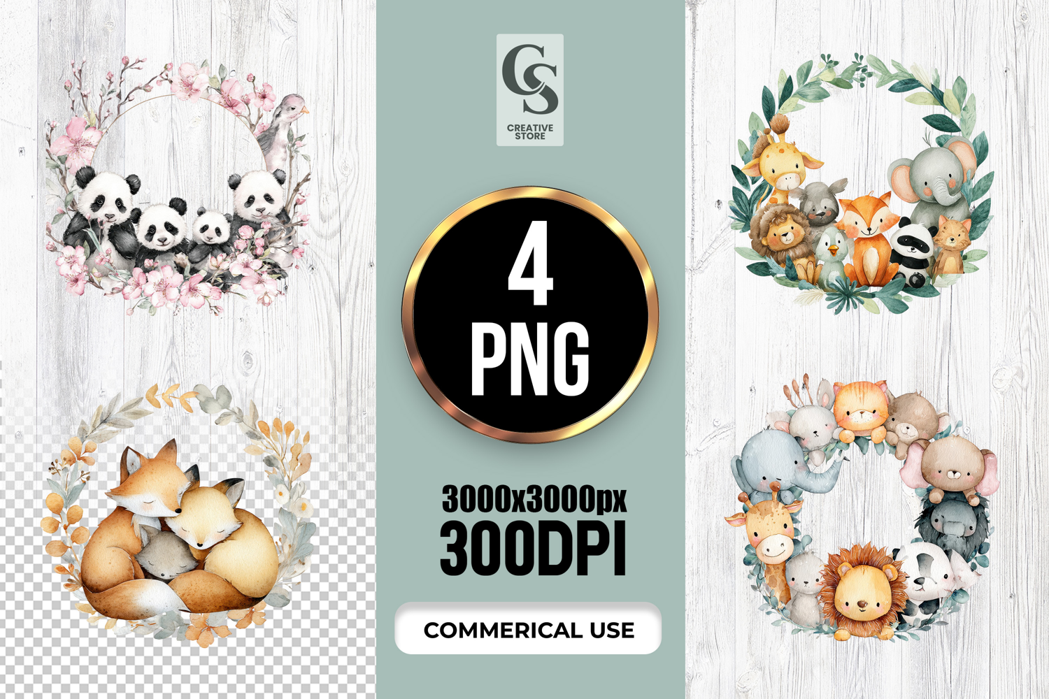 4 Cute Watercolor Animal Wreath Clipart Sublimation PNG Files Perfect for Greeting Cards, Invitations, Junk Journal, Party Decor, Scrapbooking and many other craft projects.