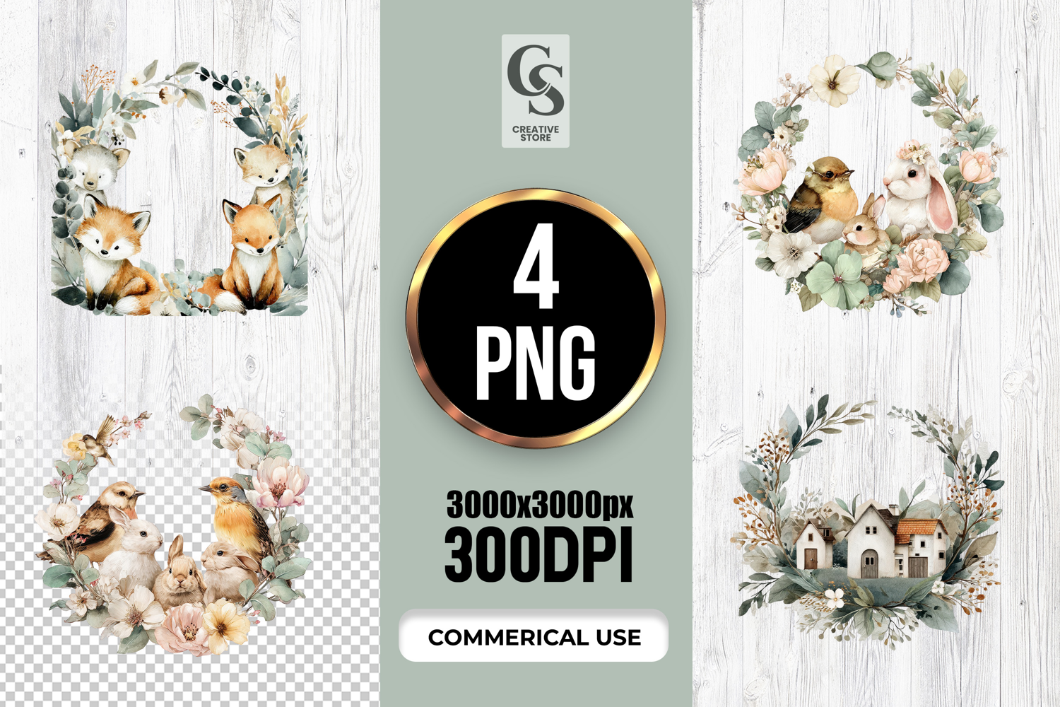 4 Cute Woodland Animal Wreath Clipart PNG Files Perfect for Greeting Cards, Invitations, Junk Journal, Party Decor, Scrapbooking and many other craft projects.