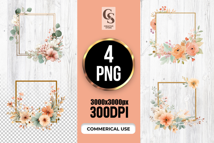 4 Peach Floral Square Frame Clipart PNG Files Perfect for Greeting Cards, Invitations, Junk Journal, Party Decor, Scrapbooking and many other craft projects.