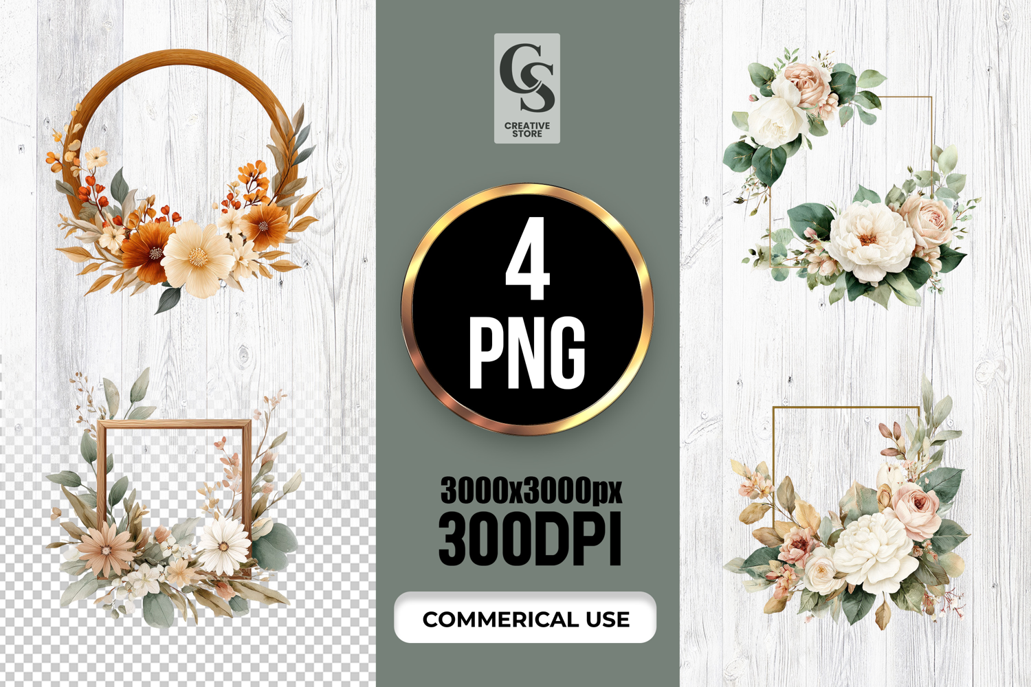 4 Elegant Floral Frames and Wreaths Clipart Sublimation PNG Files Perfect for Greeting Cards, Invitations, Junk Journal, Party Decor, Scrapbooking and many other craft projects.