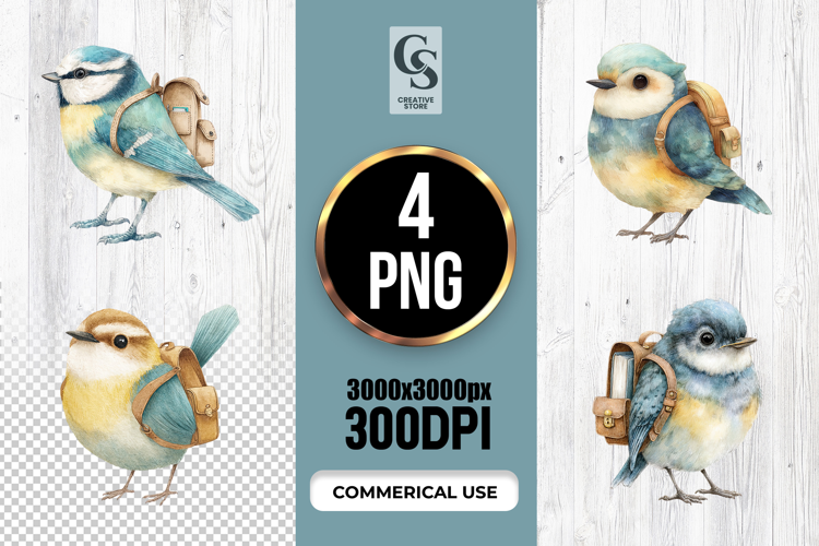 4 Cute Backpack Birds Clipart Sublimation PNG Files Perfect for Greeting Cards, Invitations, Junk Journal, Party Decor, Scrapbooking and many other craft projects.
