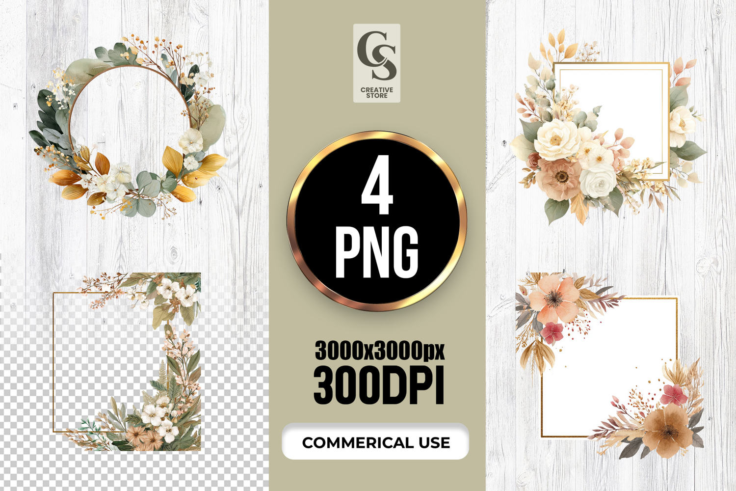 4 Neutral Floral Frames and Wreaths Clipart Sublimation PNG Files Perfect for Greeting Cards, Invitations, Junk Journal, Party Decor, Scrapbooking and many other craft projects.