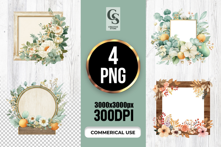 4 Rustic Floral Frames with Greenery Clipart Sublimation PNG Files Perfect for Greeting Cards, Invitations, Junk Journal, Party Decor, Scrapbooking and many other craft projects.