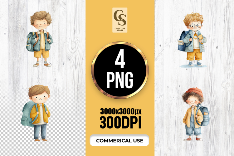 4 Cute School Boys Characters Clipart Sublimation PNG  Files Perfect for Greeting Cards, Invitations, Junk Journal, Party Decor, Scrapbooking and many other craft projects.