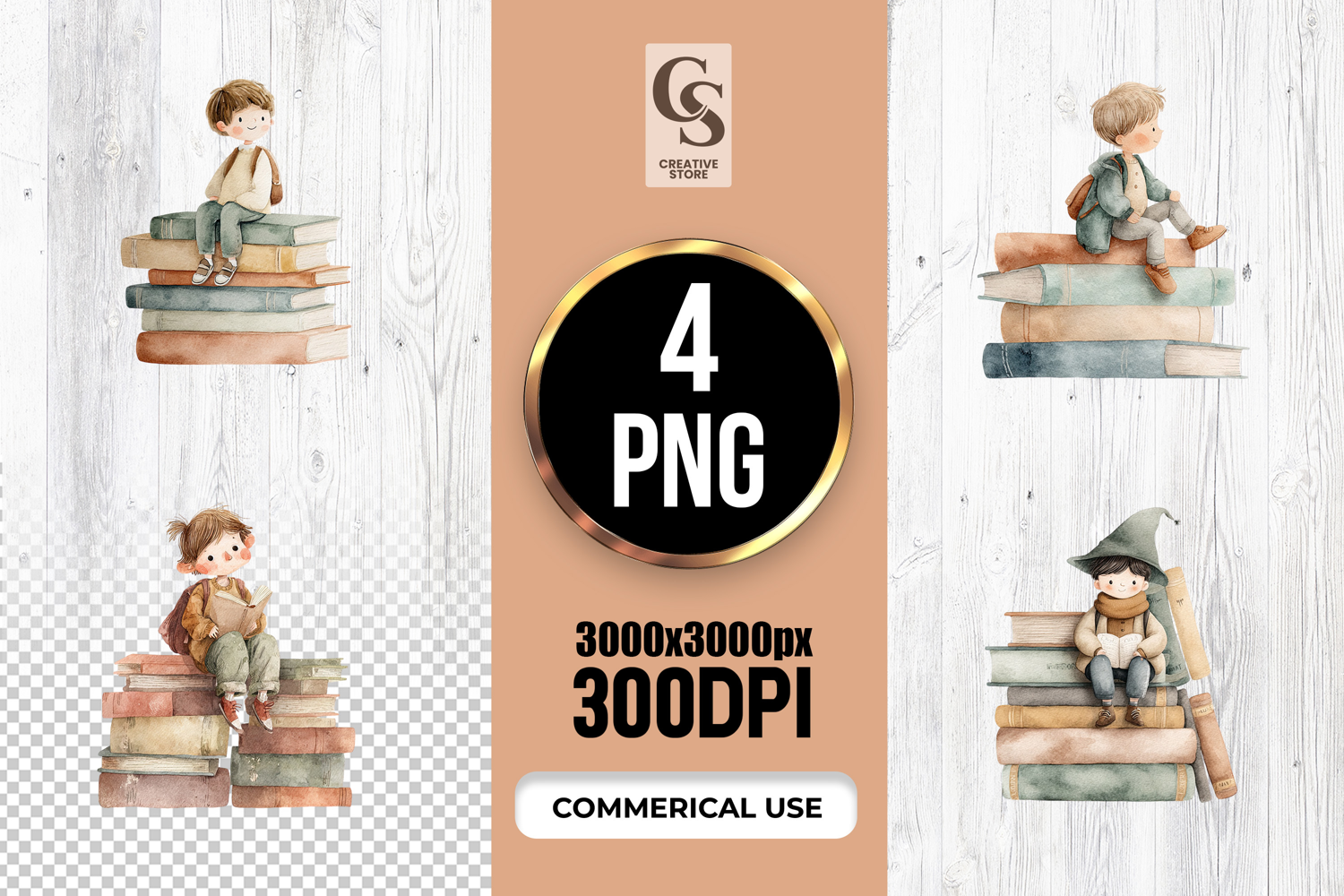 4 Cute Reading Boys on Books Clipart Sublimation PNG  Files Perfect for Greeting Cards, Invitations, Junk Journal, Party Decor, Scrapbooking and many other craft projects.
