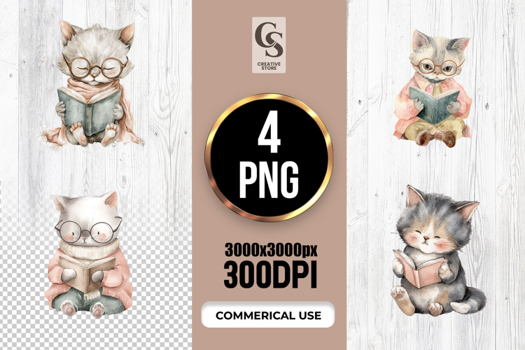 4 Cute Reading Cat School Clipart Sublimation PNG  Files Perfect for Greeting Cards, Invitations, Junk Journal, Party Decor, Scrapbooking and many other craft projects.