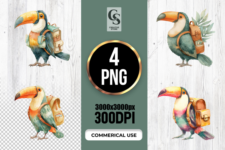 4 Cute Toucan With Backpack Watercolor Clipart Sublimation PNG  Files Perfect for Greeting Cards, Invitations, Junk Journal, Party Decor, Scrapbooking and many other craft projects.