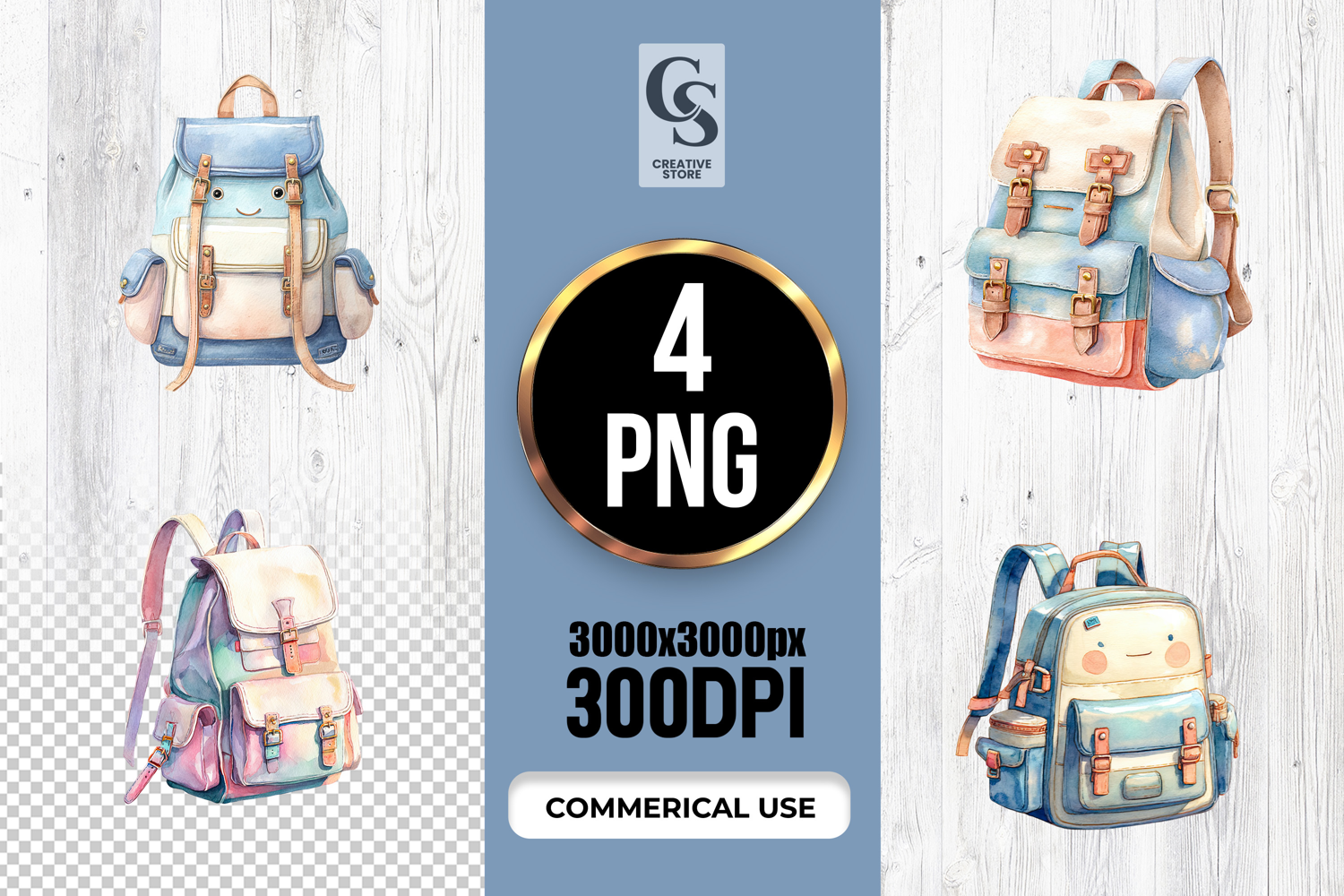 4 Cute School Backpack Watercolor Clipart Sublimation PNG  Files Perfect for Greeting Cards, Invitations, Junk Journal, Party Decor, Scrapbooking and many other craft projects.