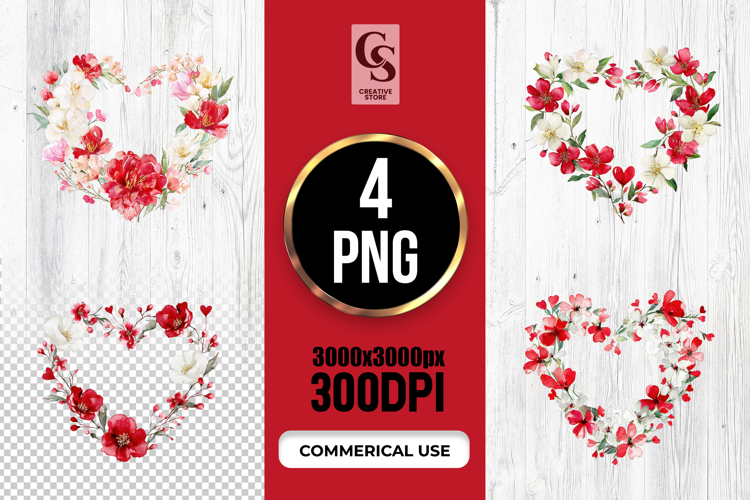 4 Watercolor Floral Heart Wreath Clipart Sublimation PNG   Files Perfect for Greeting Cards, Invitations, Junk Journal, Party Decor, Scrapbooking and many other craft projects.