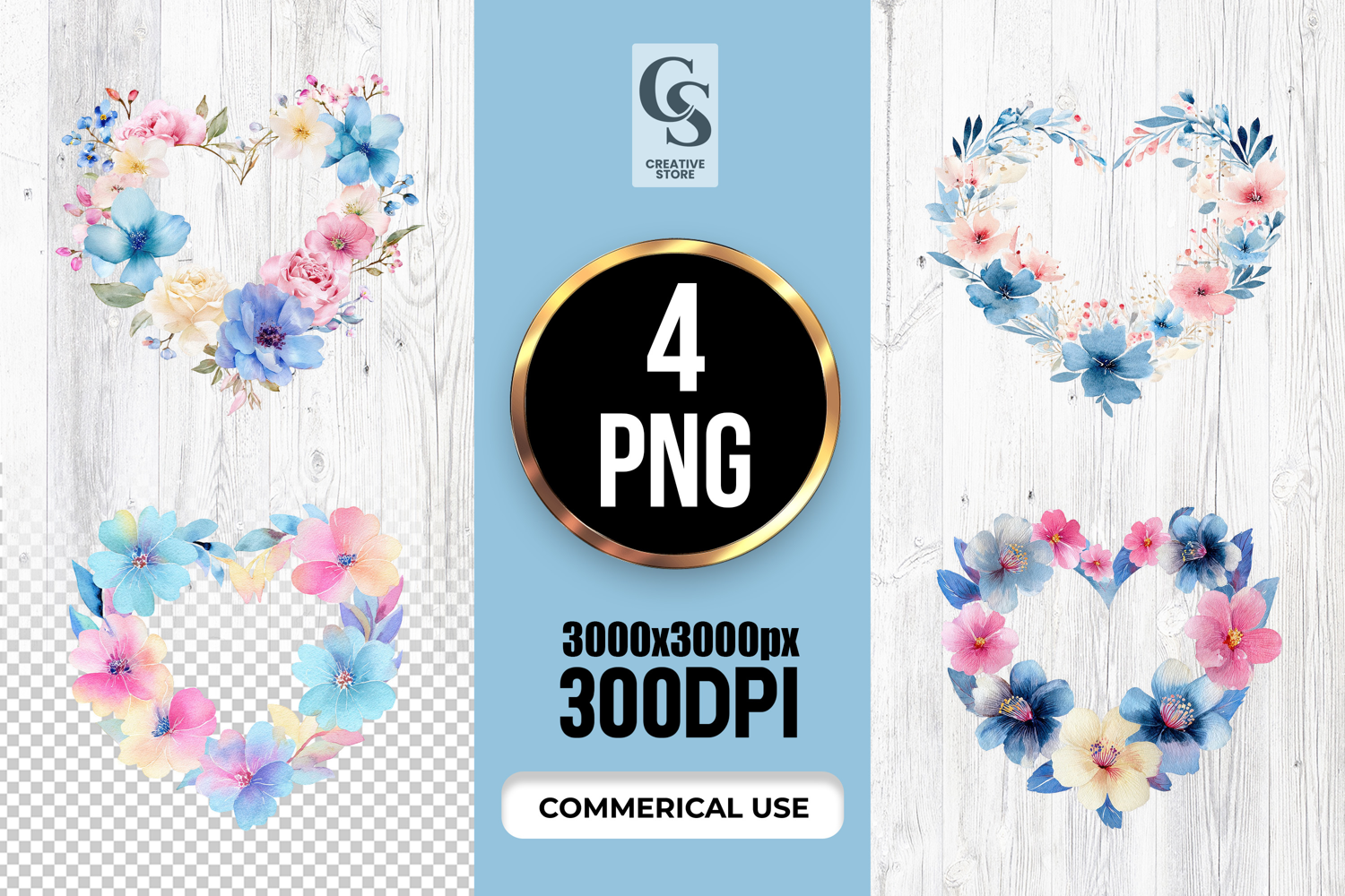 4 Watercolor Blue and Pink Floral Heart Wreath PNG   Files Perfect for Greeting Cards, Invitations, Junk Journal, Party Decor, Scrapbooking and many other craft projects.