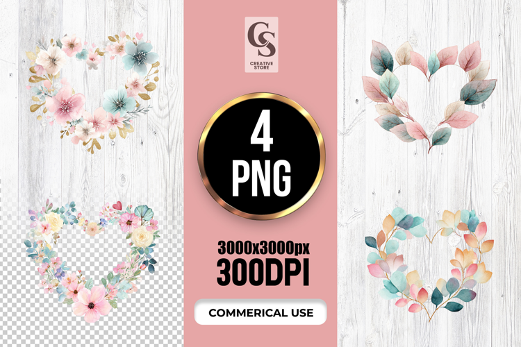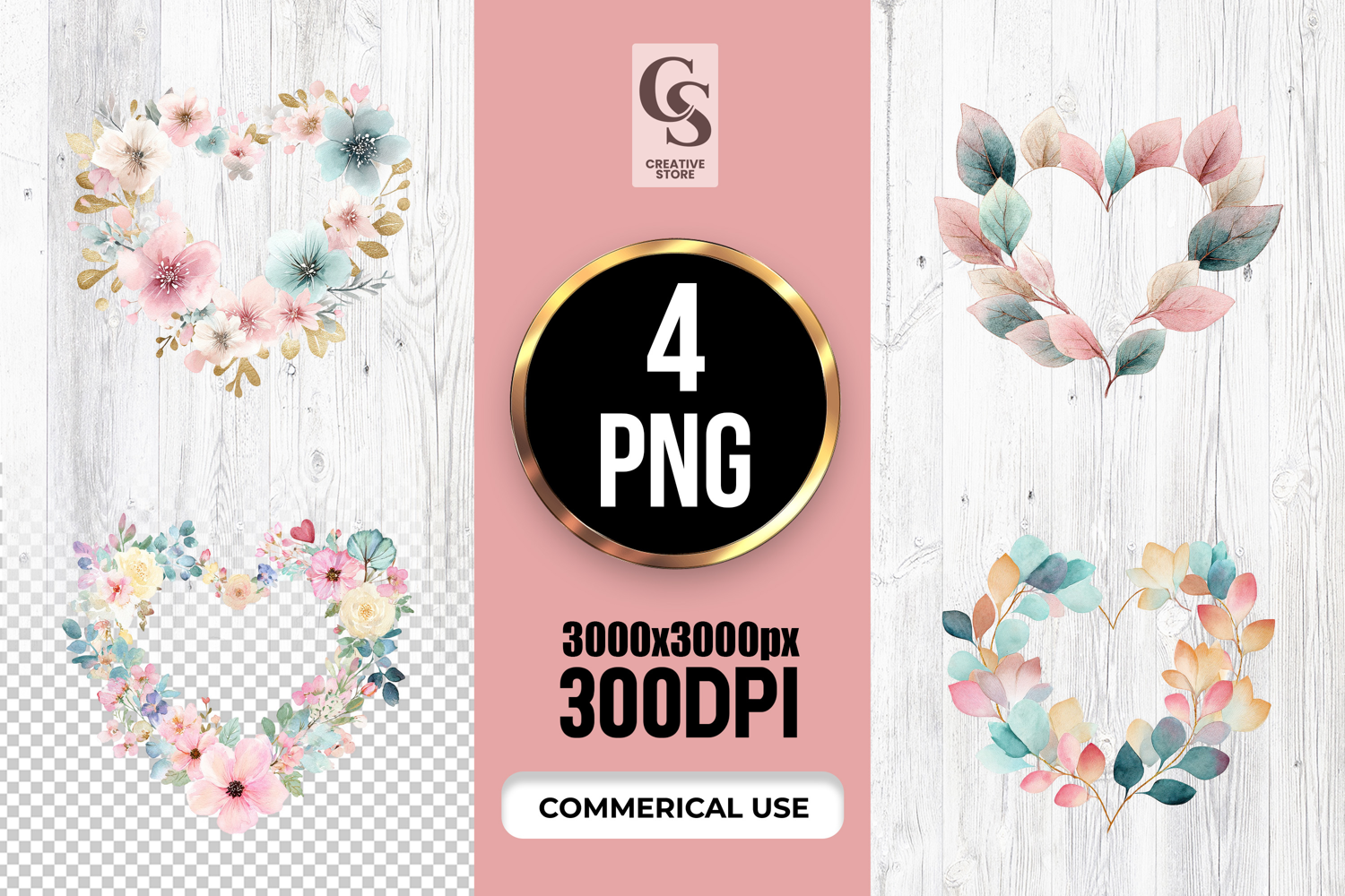 4 Watercolor Floral Heart Clipart Sublimation PNG    Files Perfect for Greeting Cards, Invitations, Junk Journal, Party Decor, Scrapbooking and many other craft projects.
