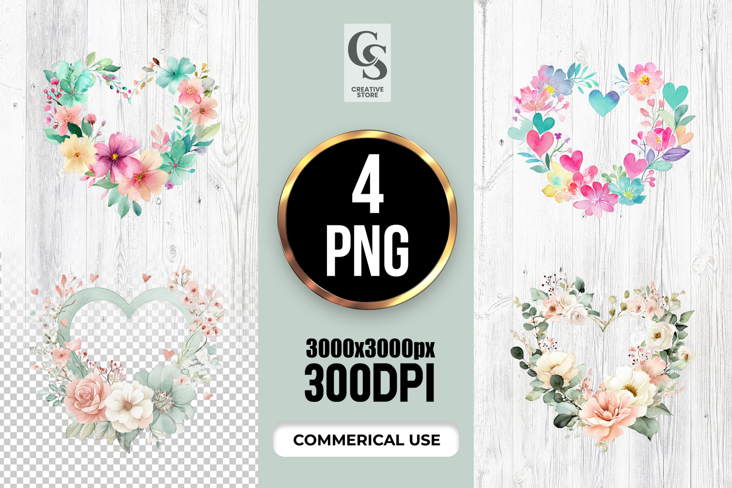 4 Watercolor Floral Heart Wreath Clipart Sublimation PNG   Files Perfect for Greeting Cards, Invitations, Junk Journal, Party Decor, Scrapbooking and many other craft projects.