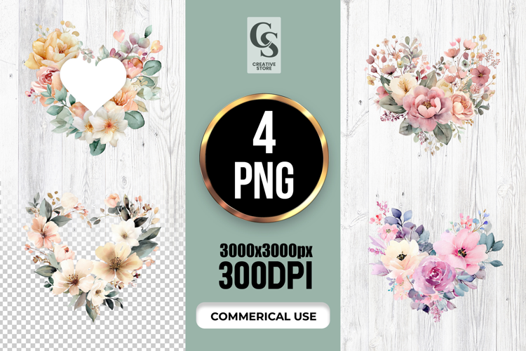 4 Watercolor Floral Heart Bouquet Clipart Sublimation PNG   Files Perfect for Greeting Cards, Invitations, Junk Journal, Party Decor, Scrapbooking and many other craft projects.