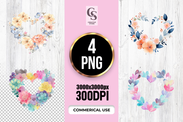 4 Watercolor Floral Heart Wreath Clipart Sublimation PNG   Files Perfect for Greeting Cards, Invitations, Junk Journal, Party Decor, Scrapbooking and many other craft projects.