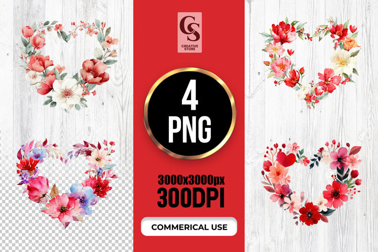 4 Watercolor Red Floral Heart Wreath Clipart Sublimation PNG   Files Perfect for Greeting Cards, Invitations, Junk Journal, Party Decor, Scrapbooking and many other craft projects.