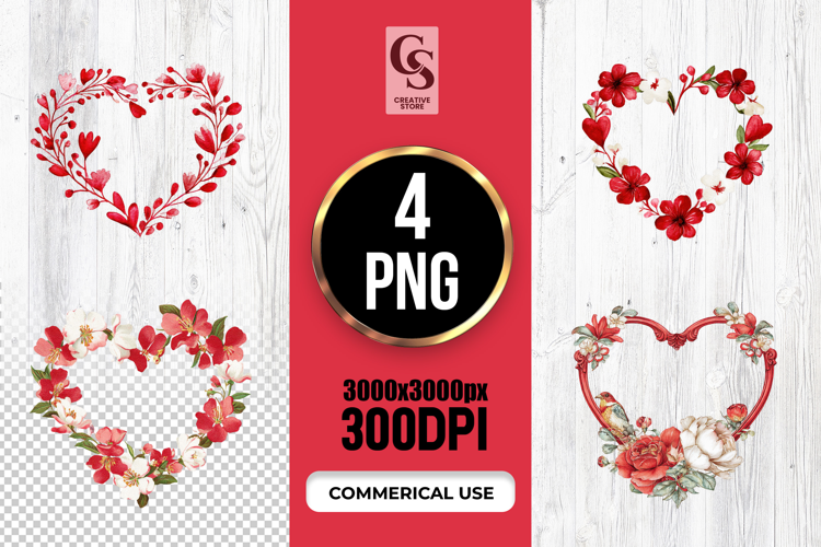 4 Red Watercolor Floral Heart Clipart Set PNG  Files Perfect for Greeting Cards, Invitations, Junk Journal, Party Decor, Scrapbooking and many other craft projects.