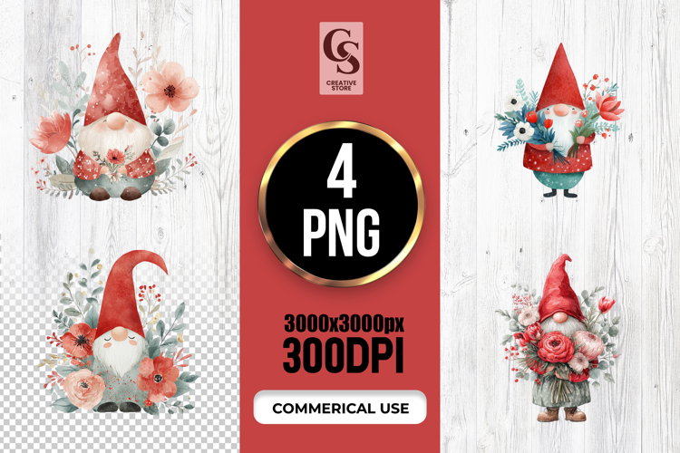 4 Watercolor Red Floral Gnome Clipart Sublimation PNG Files Perfect for Greeting Cards, Invitations, Junk Journal, Party Decor, Scrapbooking and many other craft projects.